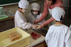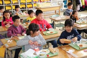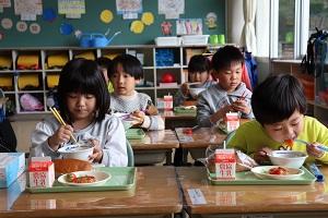 今日の1年生は、初めての給食。協力して準備をして、上手に食べることができました。