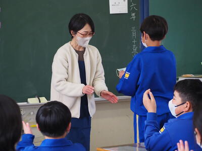2024年3月19日 13時12分学校司書の新田先生より6年生にしおりのプレゼントがありました。これまで使用してきた図書室利用カードをラミネート加工したもので、裏にははじめて図書室で借りた本の名前も入っていました。