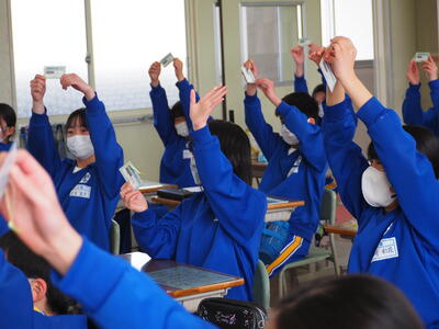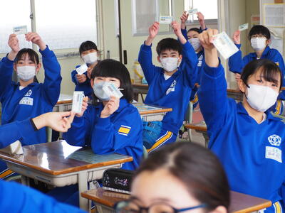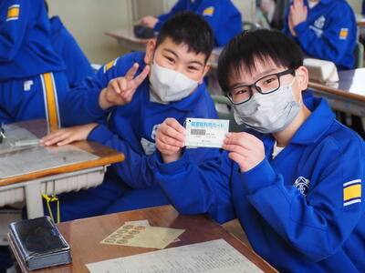学校司書の新田先生より6年生にしおりのプレゼントがありました。これまで使用してきた図書室利用カードをラミネート加工したもので、裏にははじめて図書室で借りた本の名前も入っていました。