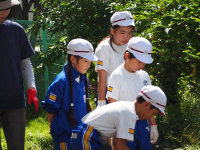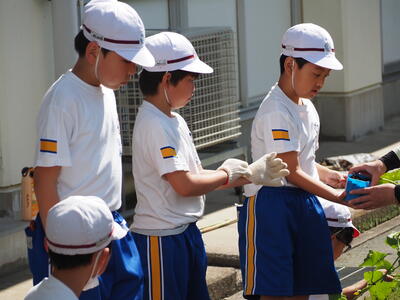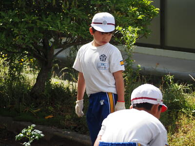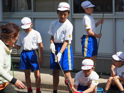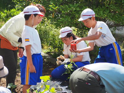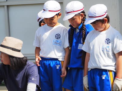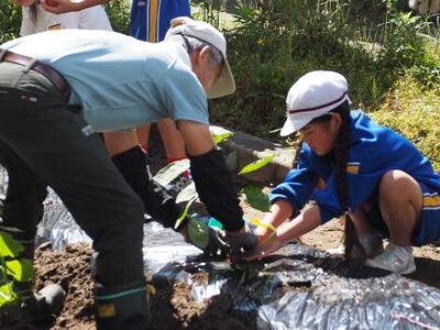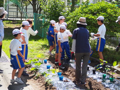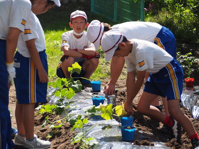 用務員の山口さんのご協力の下、2・3組合同で苗植えを行いました。植えたのはトマトやきゅうりなどの夏野菜とさつまいもです。収穫が楽しみです。