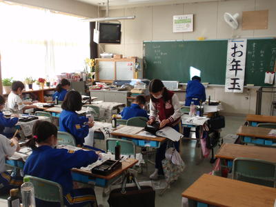 3年生は、「お年玉」という字を、書初め用紙に書きました。