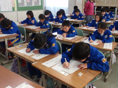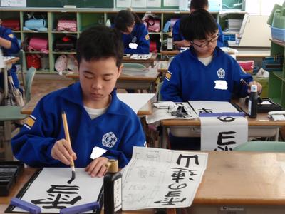1・2校時に、3年生の「校内書きぞめ会」がありました。いわゆる「席書大会」で、今日この場で書いた作品の中で一番上手にできたものを飾って審査します。