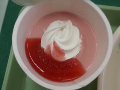 ミネストローネ、チキン、ロールパン、デザートはババロアでした。