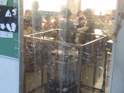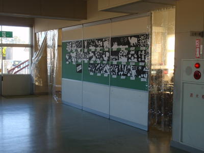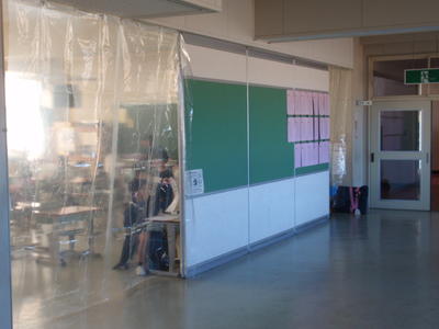 本校東校舎はオープンスペースの作りで教室と廊下の境がなく、ストーブをつけてもなかなか温まりません。そこで、出入口にカーテンを設置して、冷気の流れを少しでも遮断しようと努めています。