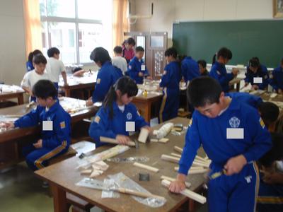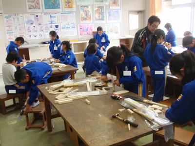 4年生の図工、木材にくぎを打ったり、のこぎりで切ったりする活動です。