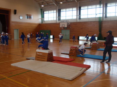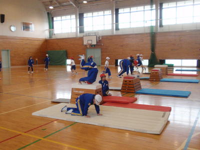 3年生の体育、「開脚とび」「閉脚とび」「台上前転」など、いろいろな技に挑戦しています。