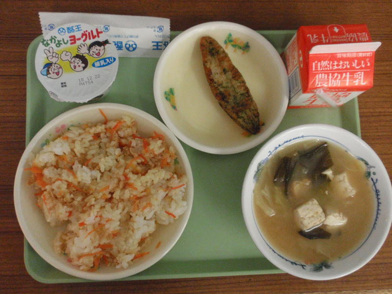 大人気の「ツナごはん」をメインに、笹かまの磯辺揚げ、味噌汁、ヨーグルトと、とてもバランスの良い献立でした。さすが、健康委員会! 美味しいだけでなく、栄養のバランスもちゃんと考えた素晴らしい献立でした。ごちそうさまでした。