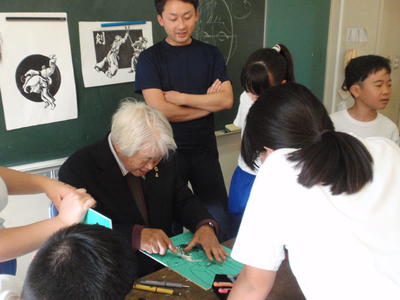 坂本先生の「彫り」の実技指導。見事な手さばきに見入る子供たち。