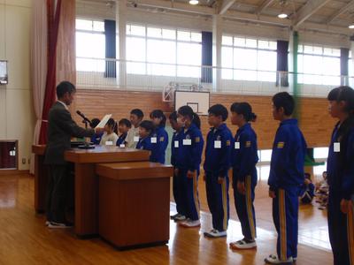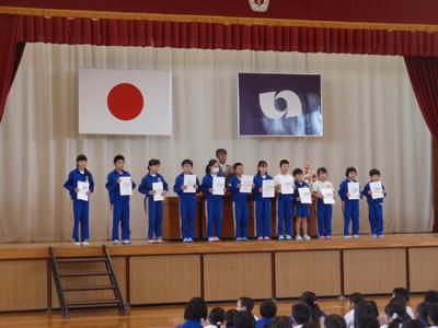 先週の「走ろう会」(校内持久走記録会)での各学年の優勝者です。3位までに賞状が授与されます。