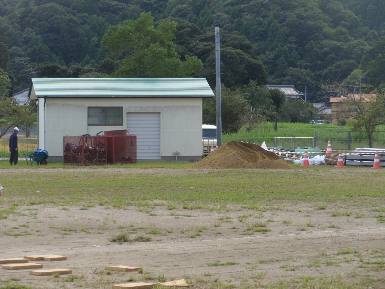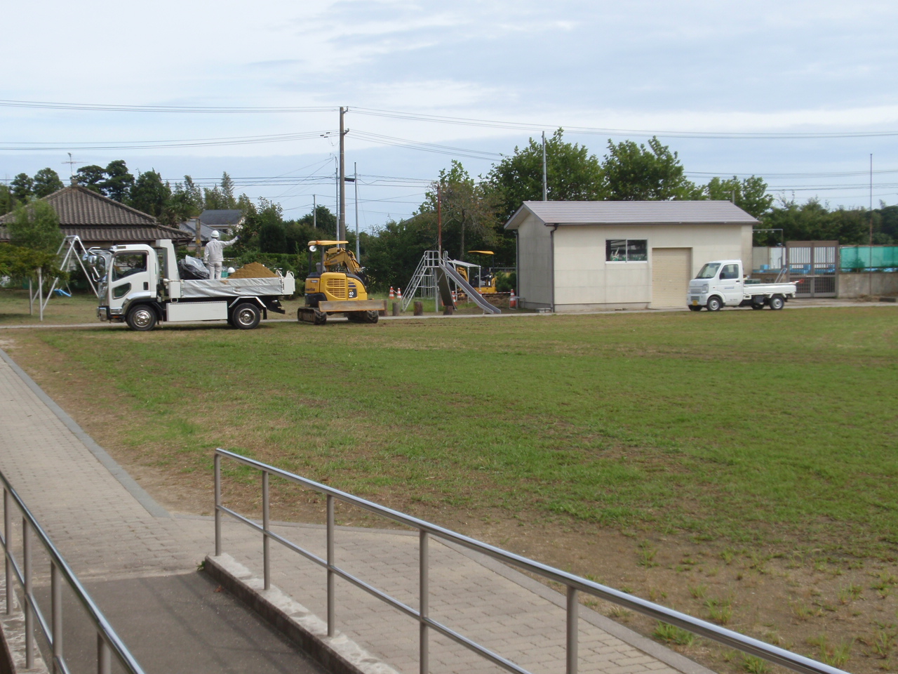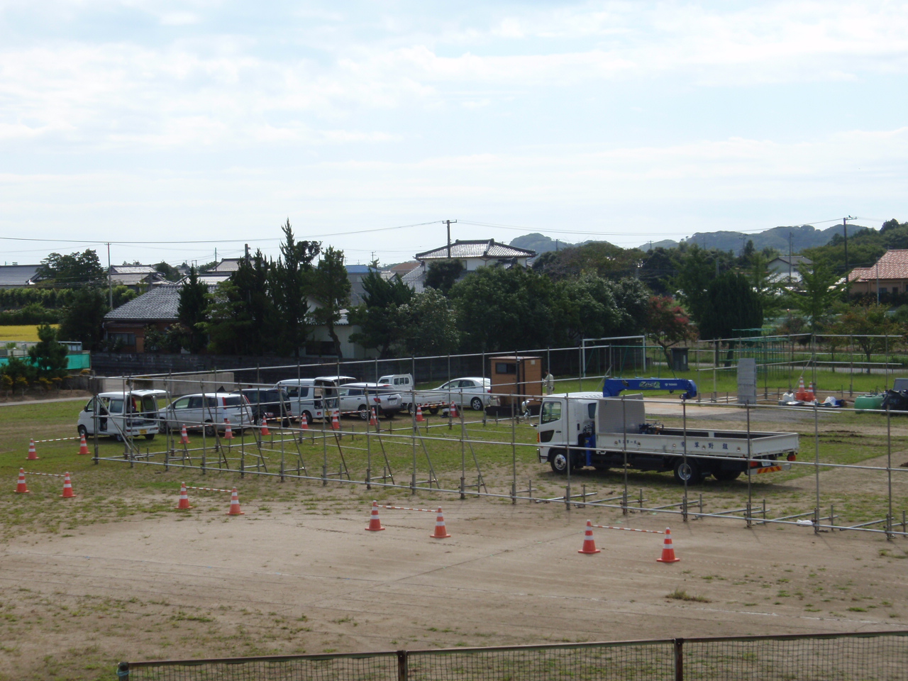 本日より、除染土壌の搬出作業が始まりました。既に7月19日付けの文書(いわき市教育委員会教育部長より)でお知らせしたものですが、東日本大震災時の原発事故に伴う除染作業で発生した除去土壌を、完全に搬出するものです。校庭の南側半分程度の広さに、高さ3mの仮囲いを設置して作業を行いますが、工期は10月末までを予定しております。
