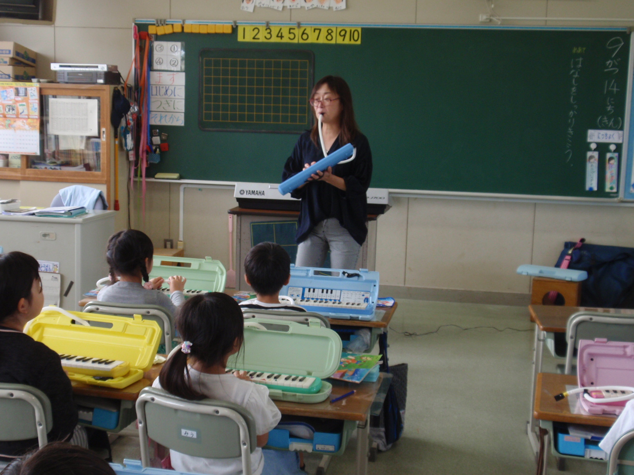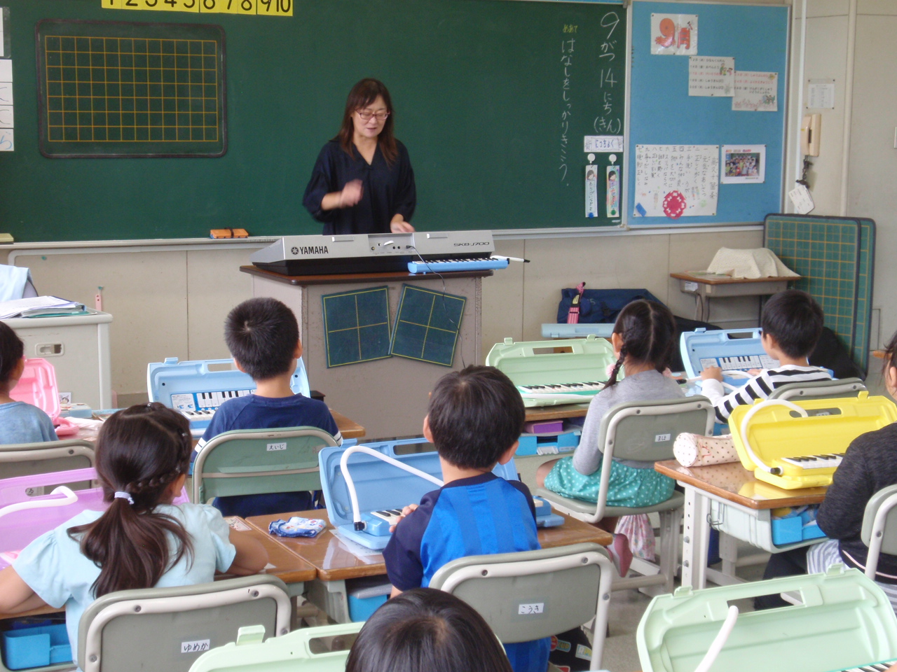 5校時に、根本 美紀子 先生 を講師にお迎えし、「鍵盤ハーモニカ講習会」が行われました。初めて鍵盤ハーモニカにふれる1年生に、ホースのつなぎ方や音の出し方などについて、楽しく教えてくださいました。