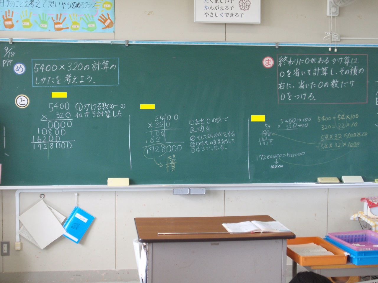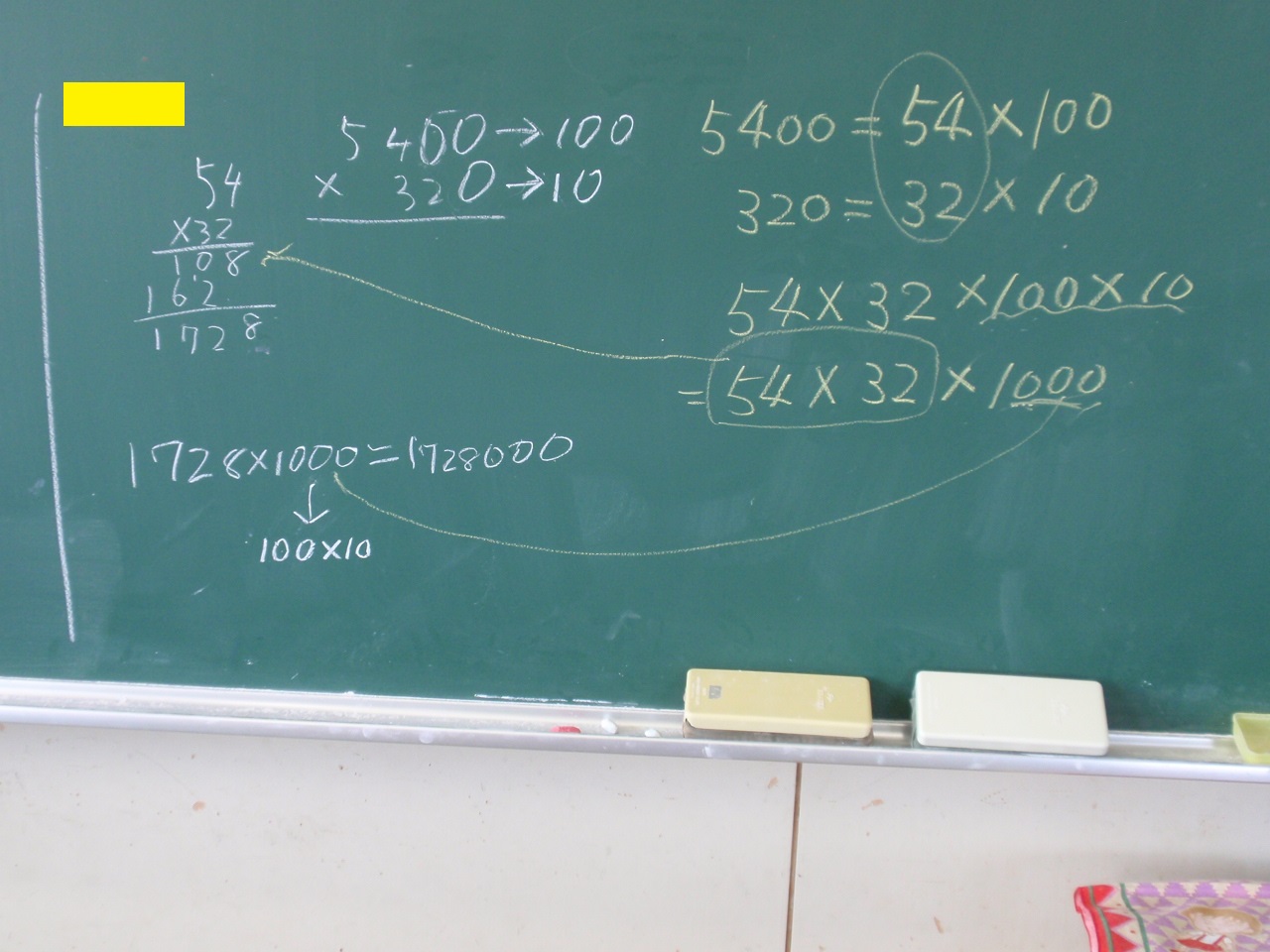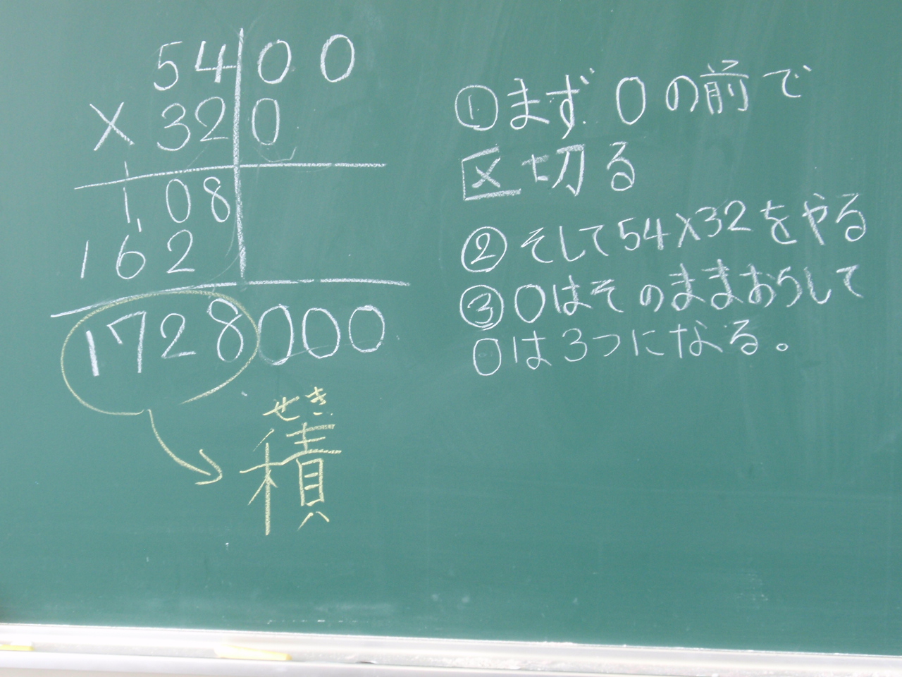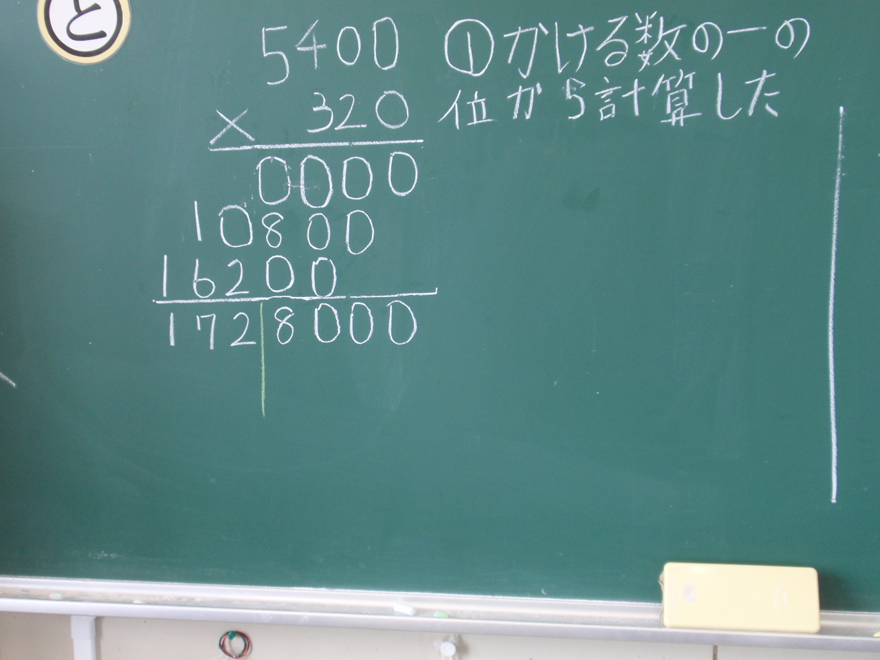 今日の授業のねらいは、「5400×320の計算の仕方を考えよう」でした。「答えを求めよう」ではありません。「計算の仕方を考えよう」がねらいであり、よりクリアな求め方を工夫することが大切です。