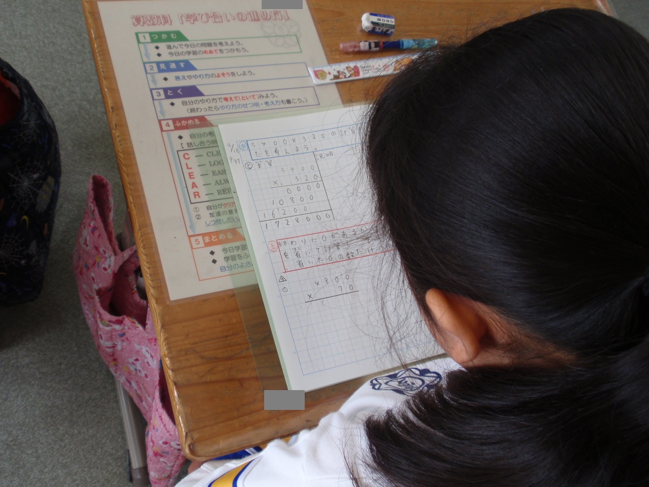 「CLEAR」(クリア)は、本校が今年度から取り入れている学び合いの観点です。私が15年ほど前に勤務していた某学校で、算数部の仲間と考えた観点ですが、「すっきり・簡単・いつでも使える」等の算数的価値をもとに話し合いを進めることで、数学的思考力を育成するのにとても役立っています。話し合いの中で、「この2つは似ているね」とか、「こっちの方が簡単だよね」「この方が間違いが少なくていいんじゃない」など、それぞれの方法の良さや共通点、違いなどに気づいていきます。
