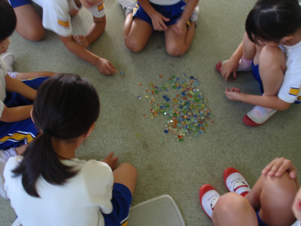 中でも、ひもを使って回すコマには悪戦苦闘でした。まず、ひもをコマに巻き付けるのに、「ひもの巻き方」「ひもを巻く方向」「ひもを巻く強さ」など、力の加減やコツをつかむのに一苦労の様子。バーチャル(仮想)なゲームと違い、「昔遊び」は、子供たちにとって、新鮮な遊びのようでした。