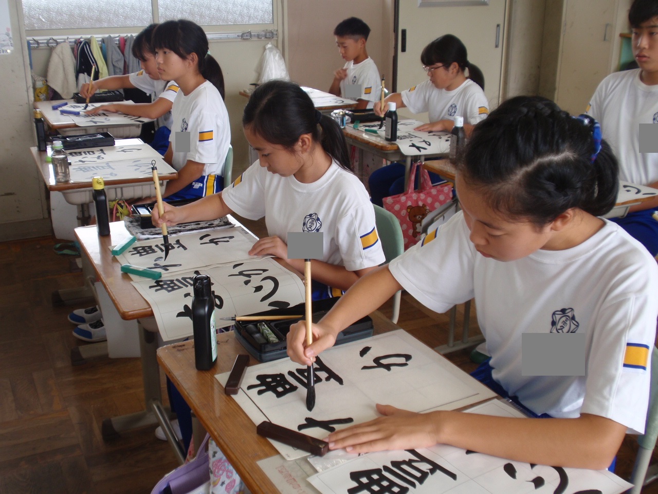 5年生の授業。文字の大きさやバランス、余白の大切さなどを学びました。