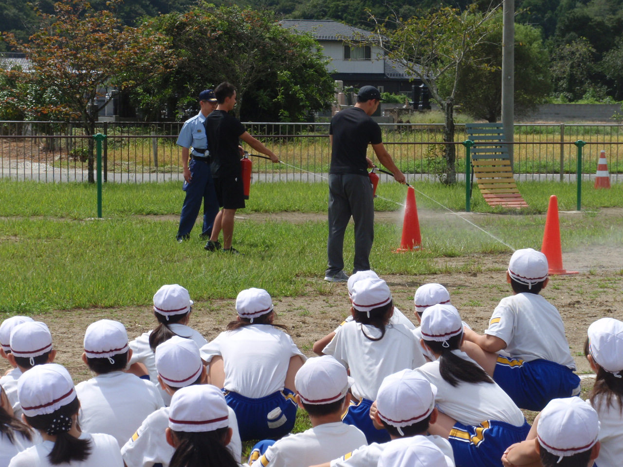 3時間目に、避難訓練を行いました。いわき市平消防署中央台分遣所の所長 平山 和哉 様を講師にお迎えし、火災を想定した訓練を行いました。避難開始の指示から避難完了まで2分強で完了し、前回の避難時間をさらに短縮しました。「命を守ること」「慌てずに指示を聞き、落ち着いて素早く行動すること」「お・か・し・も」(押さない・駆けない・しゃべらない・戻らない)「煙を吸い込まない」など、様々な注意点を確認した後、水消火器を使った消火訓練を行いました。