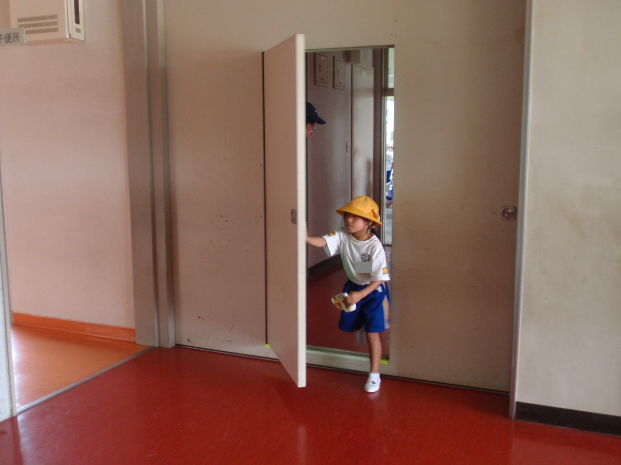 防火扉を開けて避難する訓練も行いました。慌てると、「押す」のか「引く」のか分からなくなったり、段差に躓いたりするため、一人一人が扉を開けるところから訓練しました。