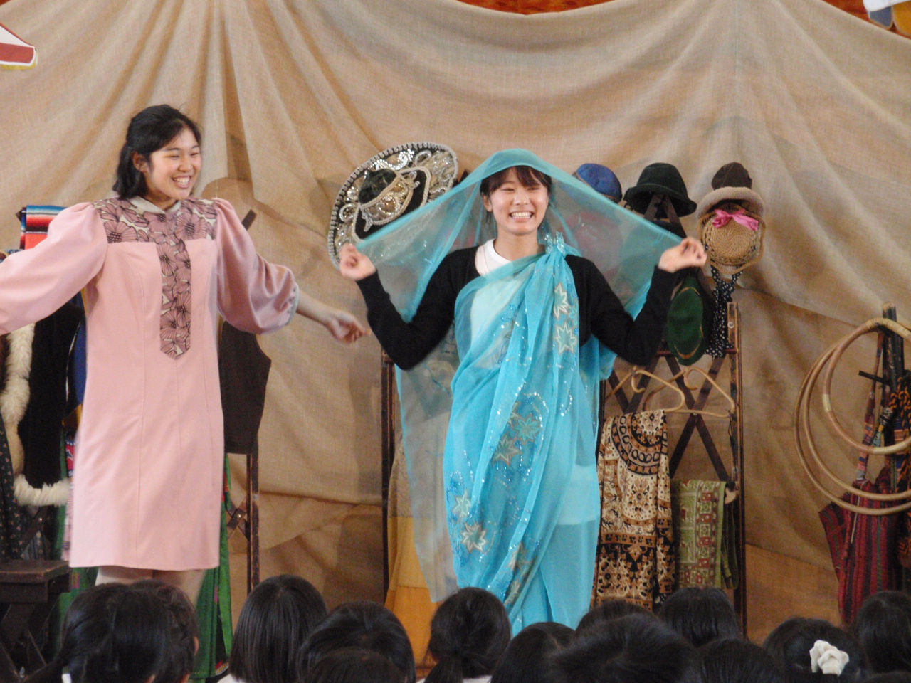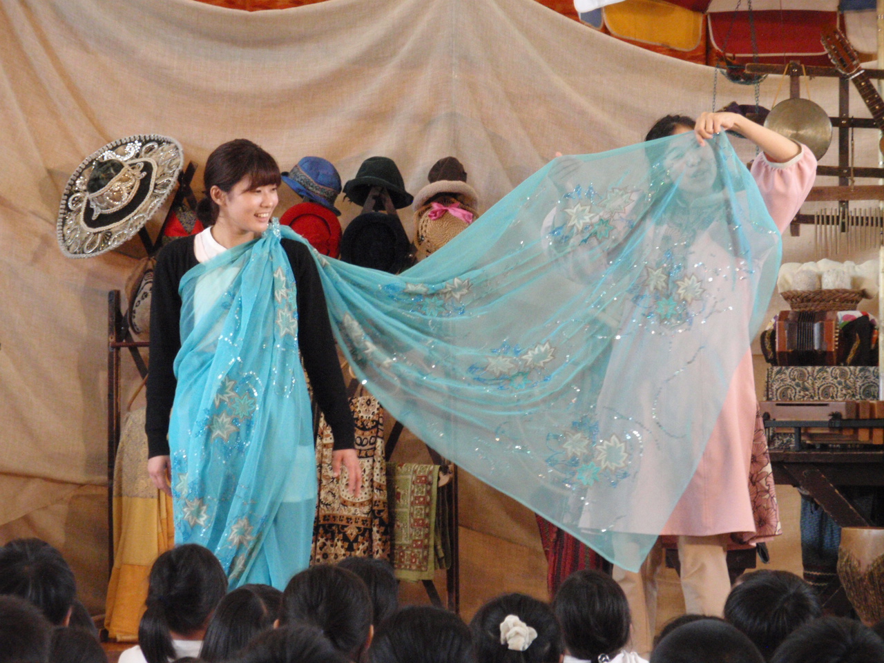 このほかにも、いろいろな民族衣装を見せてくれましたが、1枚の布が素敵な衣装に変わることに、子供たちも驚いていました。