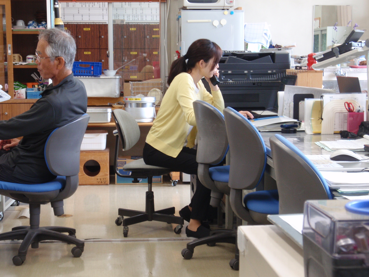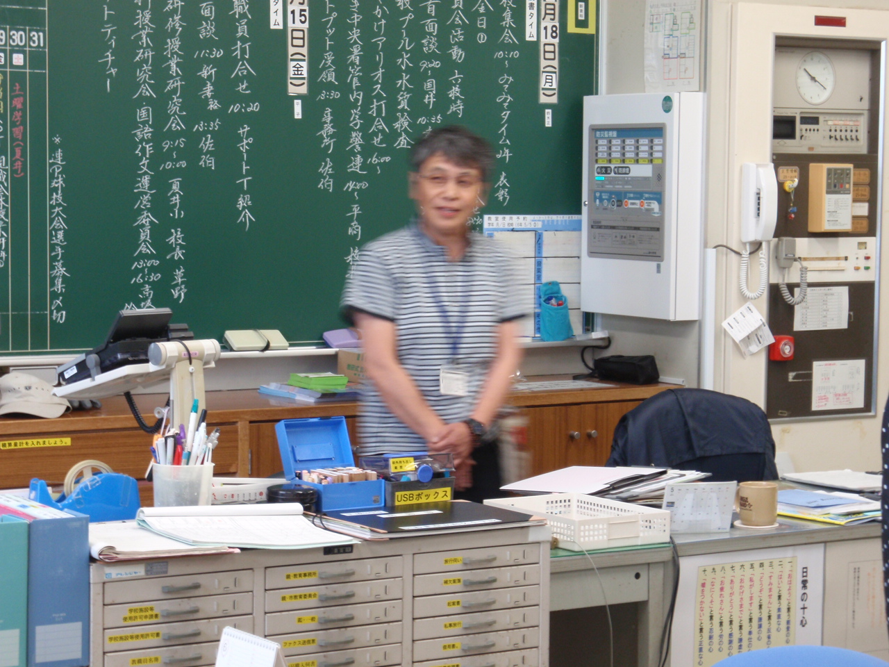 職員室の説明をしてくれたお二人、右が学校の予算・会計を担っている事務の佐伯先生です。国も財務省官僚が最高のエリートと言われるように、予算は行政の最重要部門です。その一番大切で神経を使う業務を一手に行ってくれている佐伯先生、本当に頼りになります。左が用務員の小林さん。本校勤務8年目の大ベテランで、何より仕事が丁寧で、本当に良く気が付いて作業してくださいます。