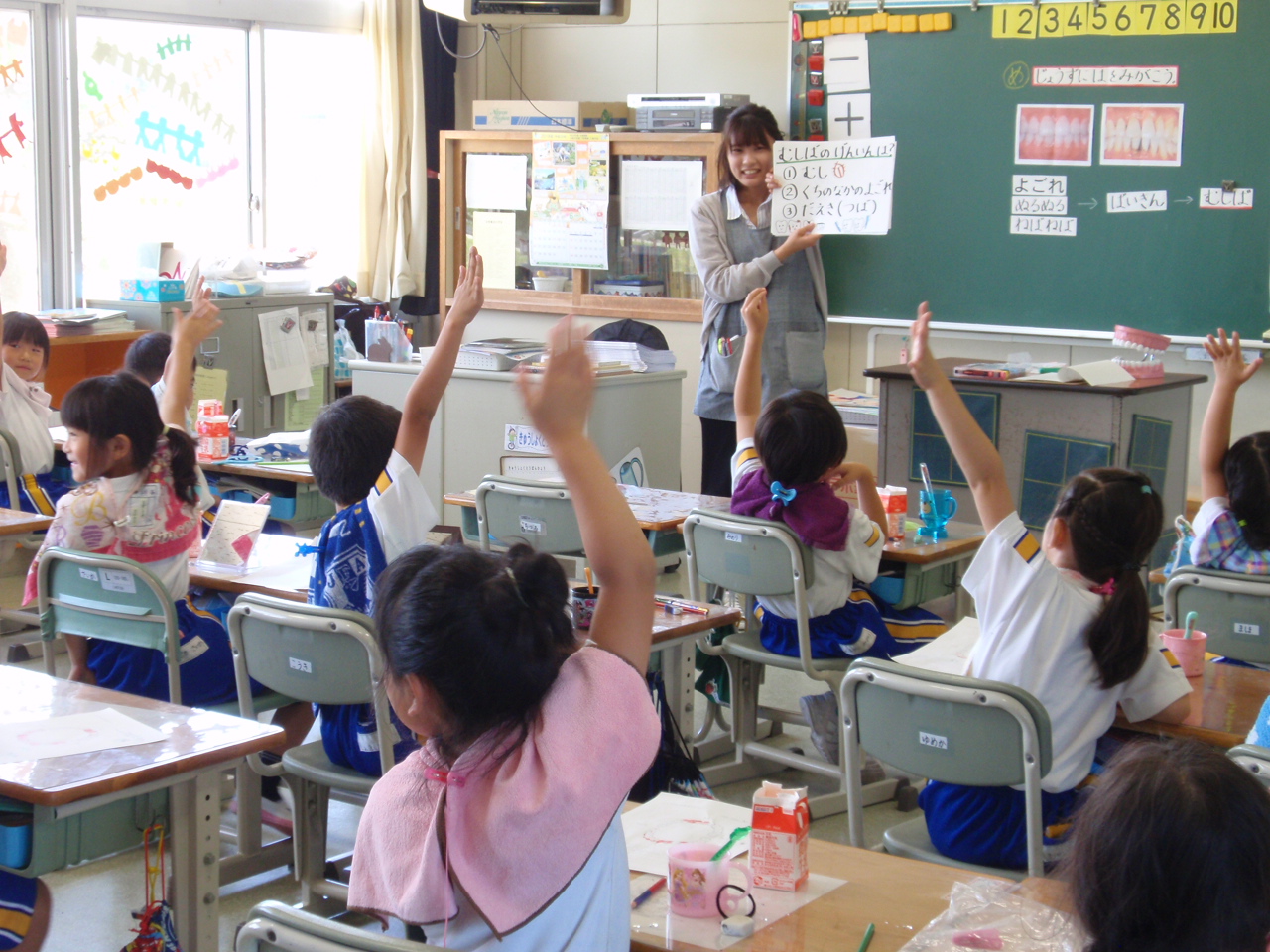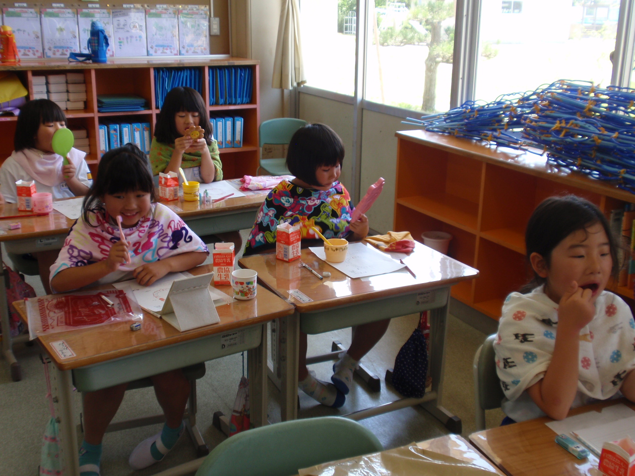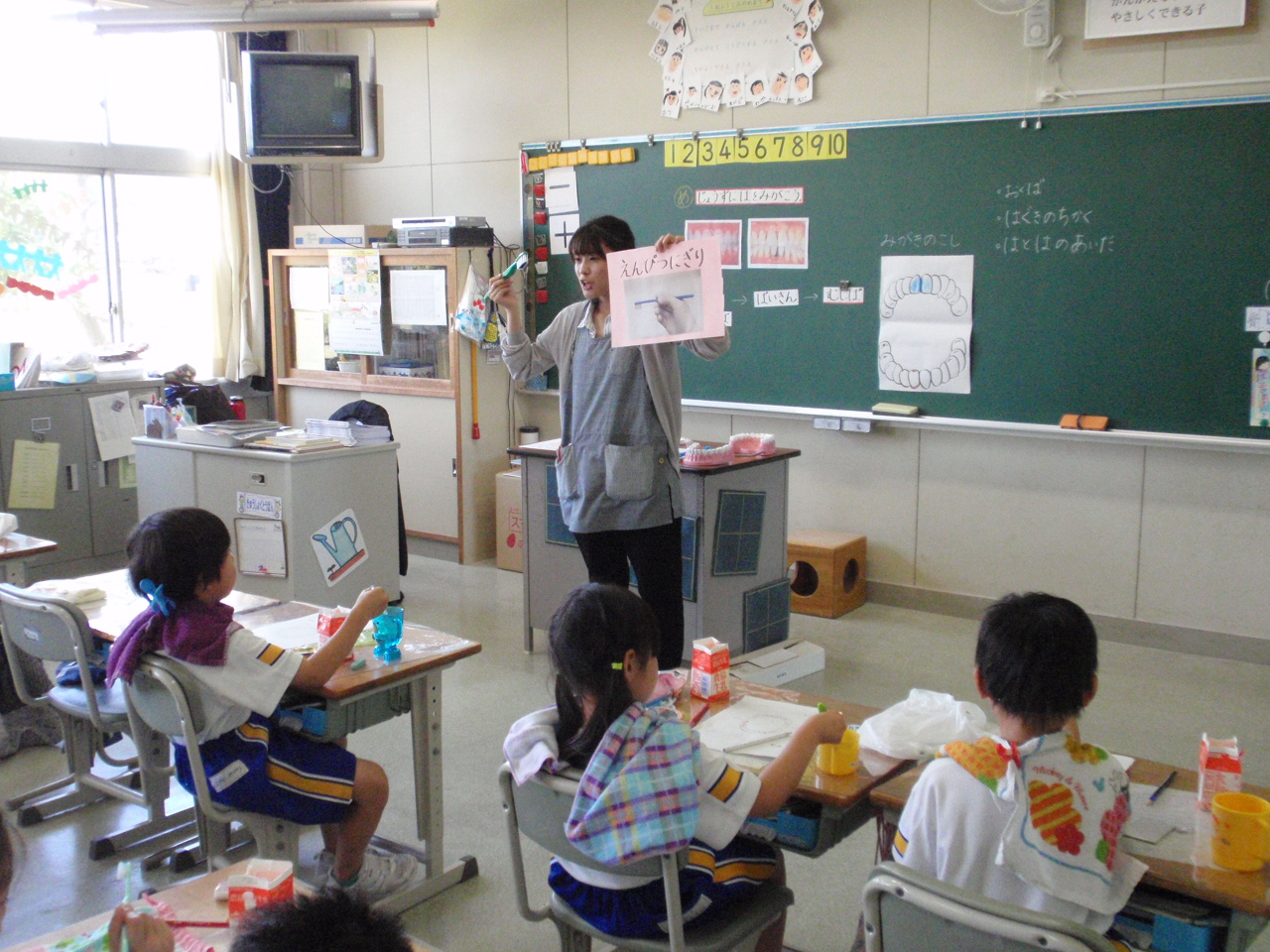 3校時に、養護教諭による1年生の歯みがき指導がありました。プラークチェッカーで磨き残しの染め出しをしたあと、正しい歯の磨き方を学びました。