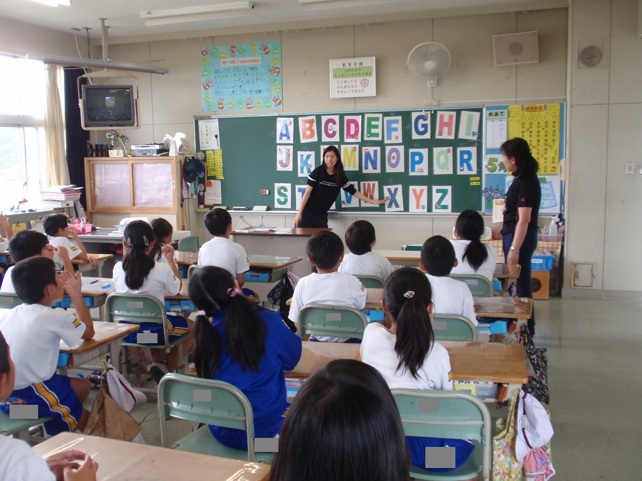 4年生では、アルファベットを楽しく覚えるため、いろいろなアクティビティを楽しみました。この写真は、一通りアルファベットに親しんだ後で行った「パチパチゲーム」です。AからZまで順に読んでいきますが、青い色の文字は読まずに(発音せずに)手を2回たたくというというものです。