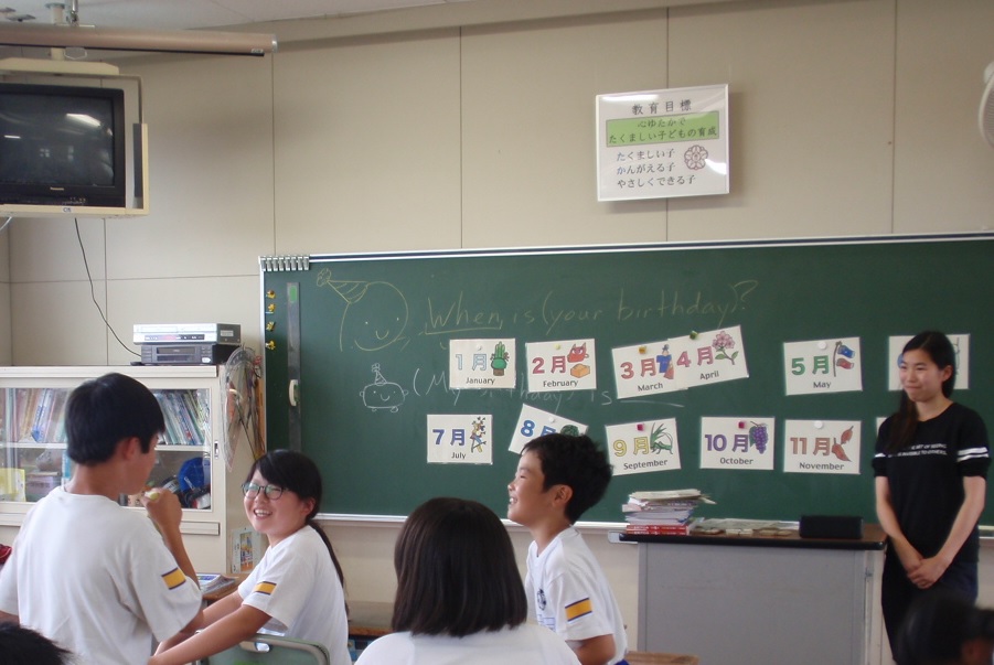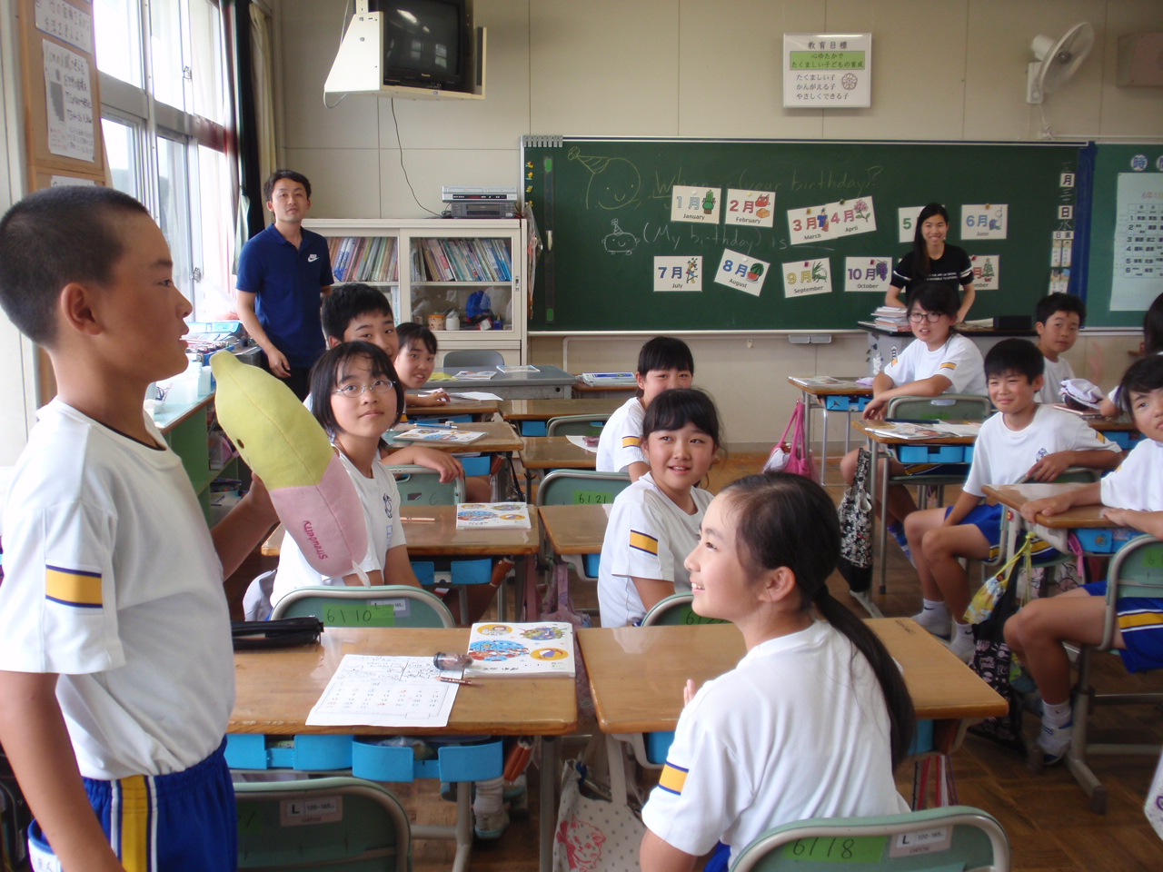 6年生では、1月~12月の英語での言い方を学習したあと、音楽に合わせてバナナマイクを回しながら止まったところでインタビューするゲームを行いました。「When is your birthday?」(誕生日はいつ?)「My birthday is ~」(私の誕生日は~です。)