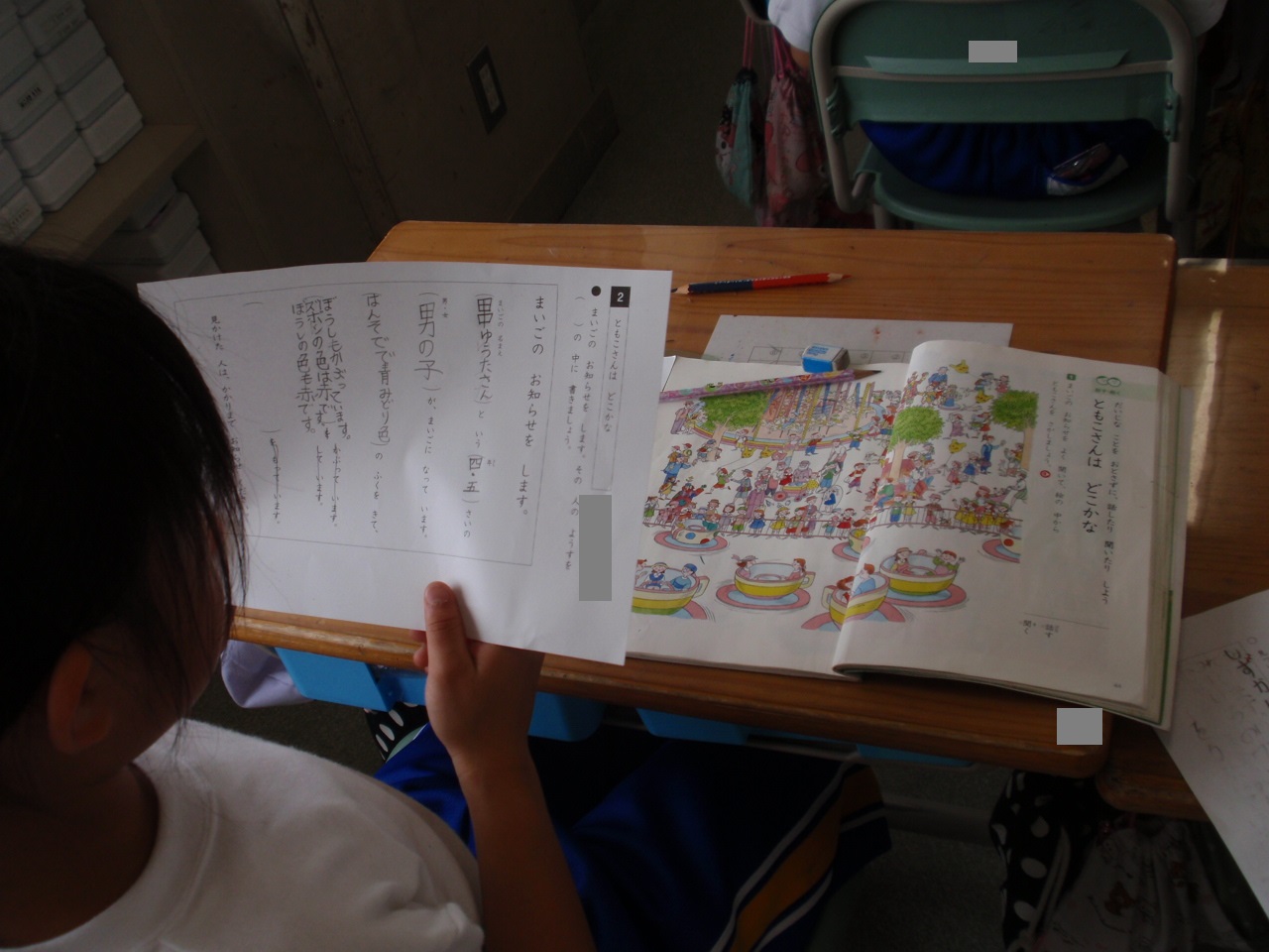 窓側の「算数コーナー」で、学習したことをもとに、違いを考えながら問題に取り組んでいます。既習(習ったこと)をもとに考える(類推・応用など)ことは、算数の大切な力「数学的思考力」を育成し、論理的思考を育みます。