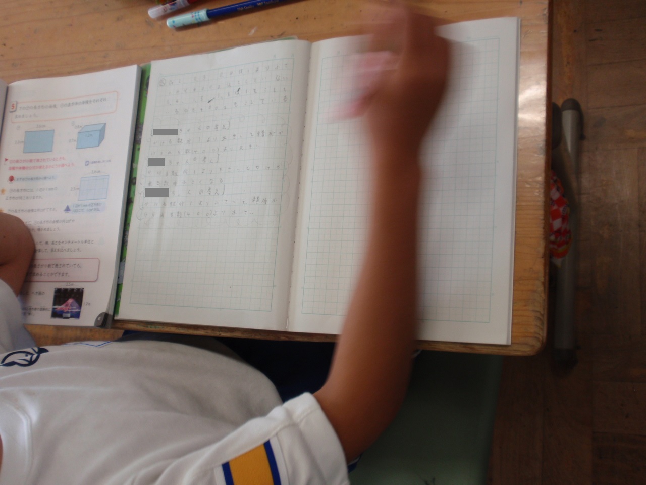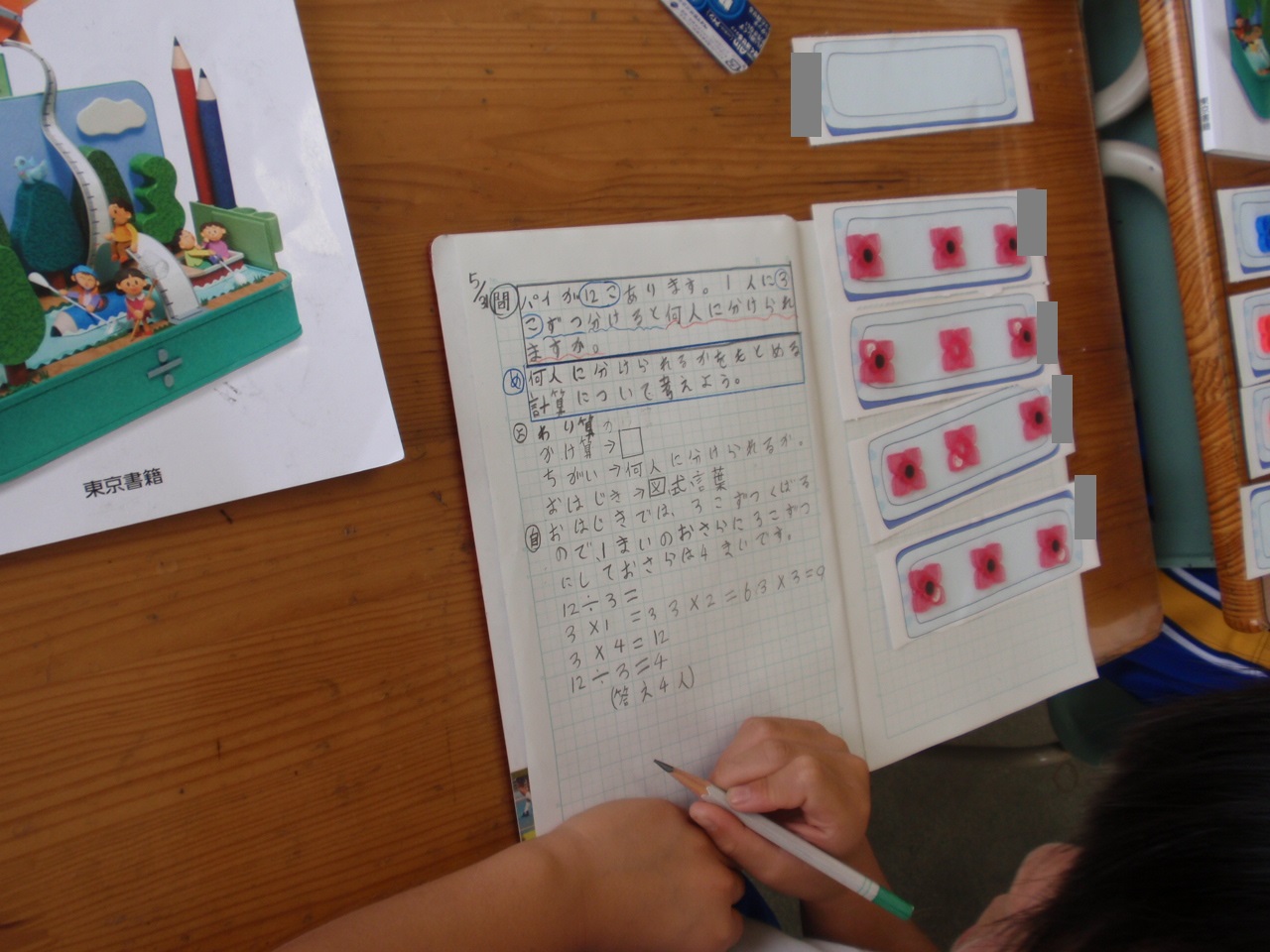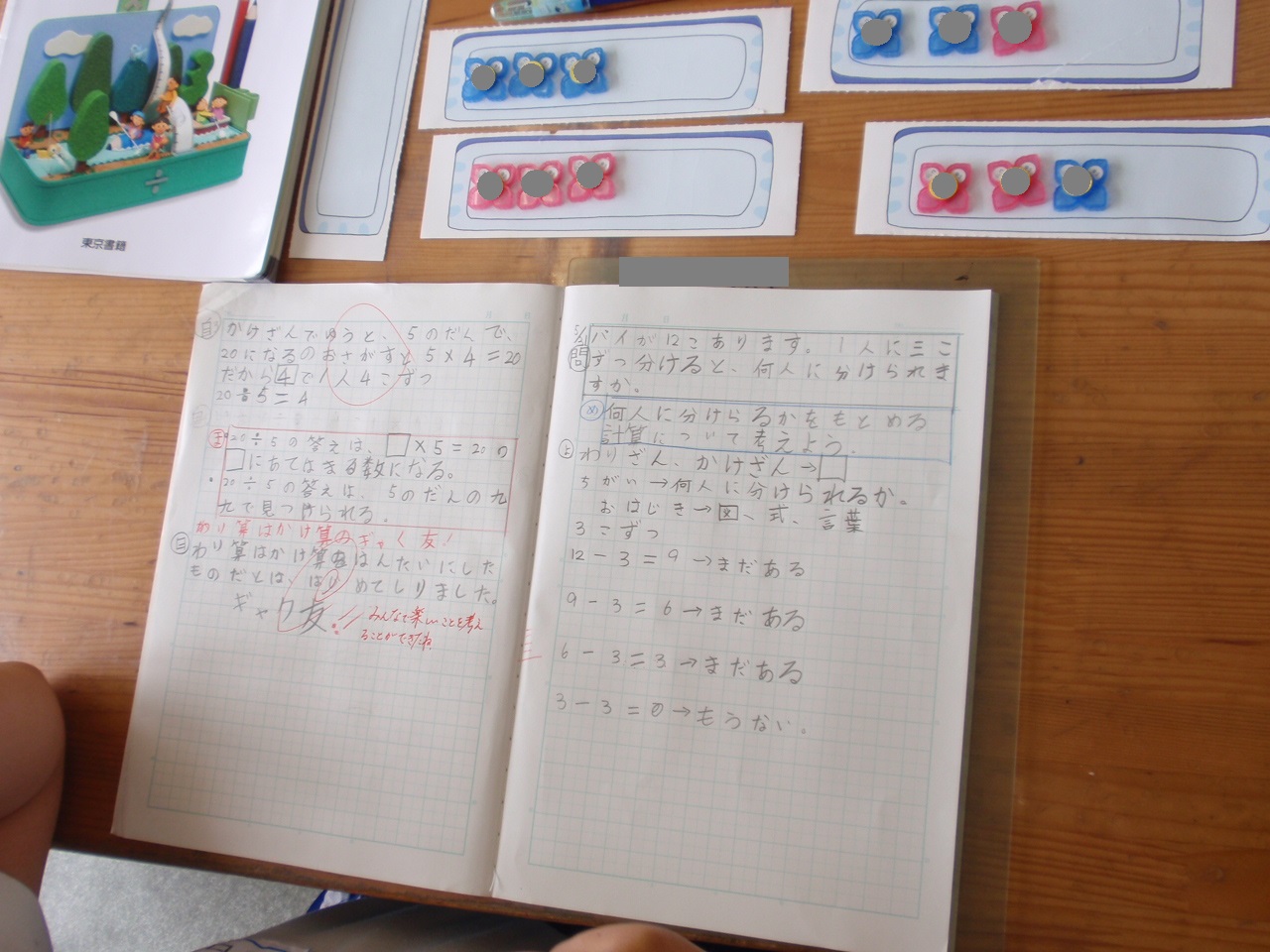 おはじきを操作しながら、考えをノートにまとめています。新しい知識は、こうした「抽象」(頭で考える)と「具体」(ものを操作してみる)との行き来の中で獲得されます。