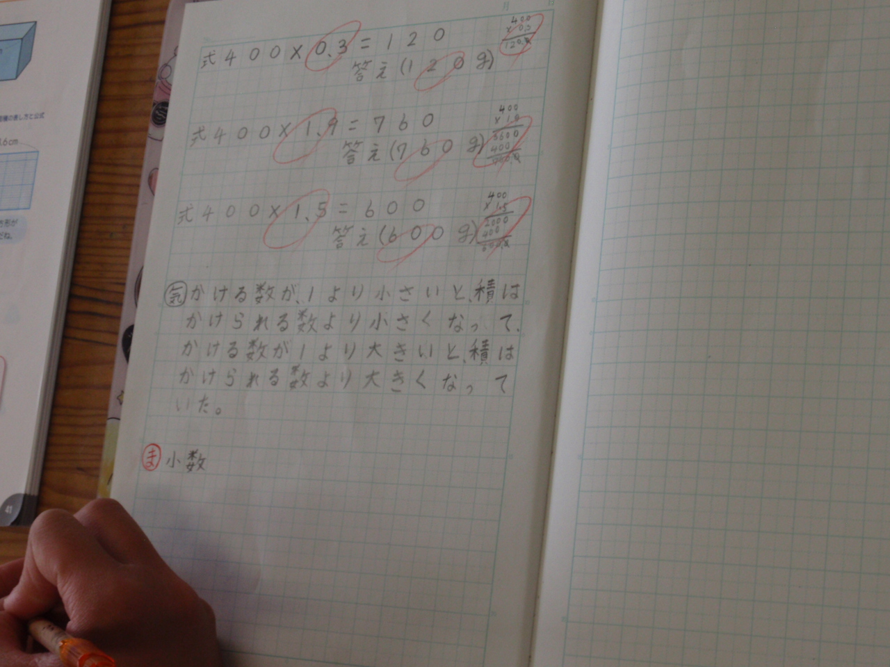 「5年:算数」~小数のかけ算で、答えがもとの数より小さくなる場合について考えました。