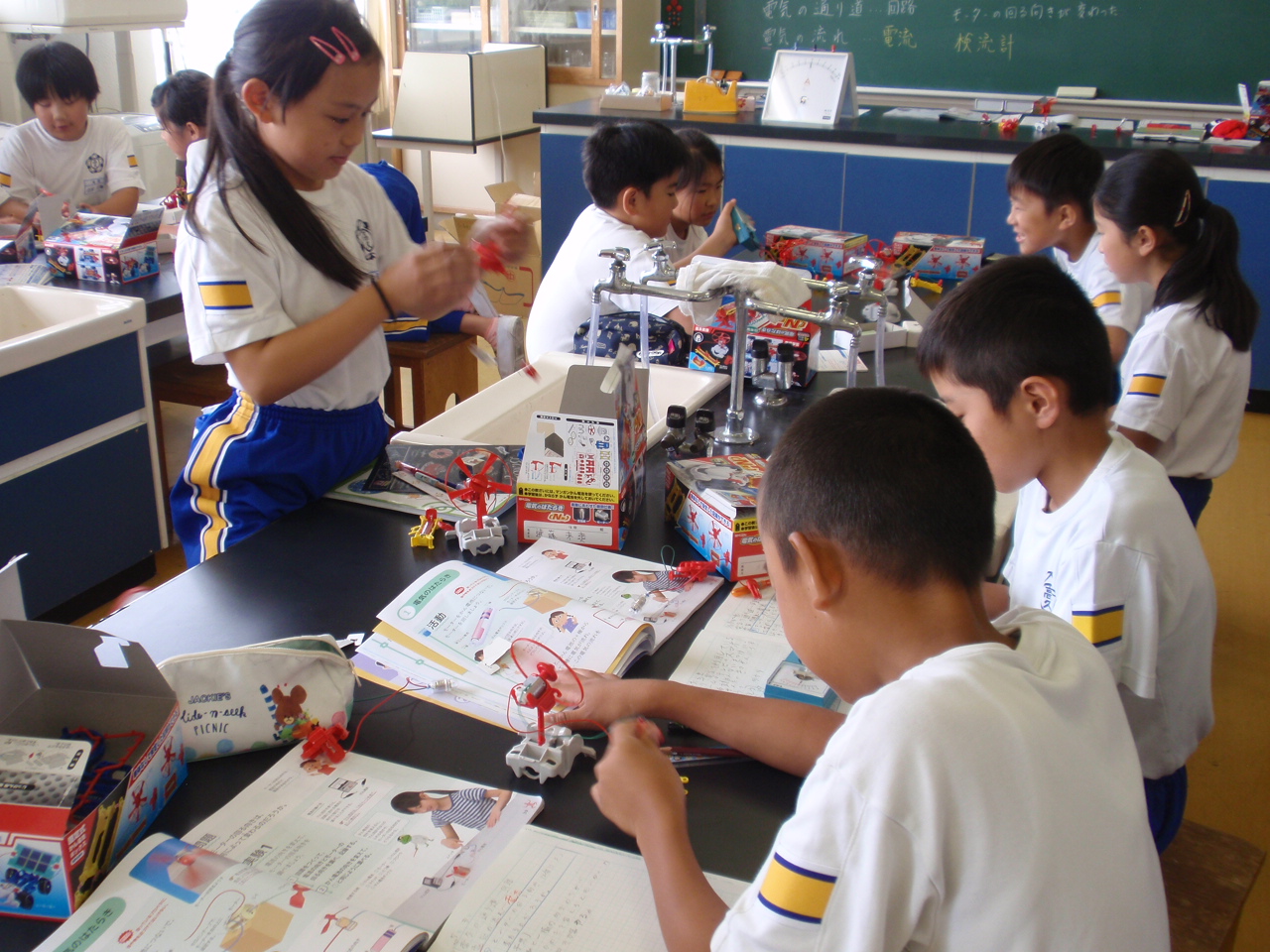 「4年:理科」~電池の向きを変えると、プロペラが回る向きが変わる理由を調べます。検流計を使って、見えない電気の流れ(向き)を「見える化」します。