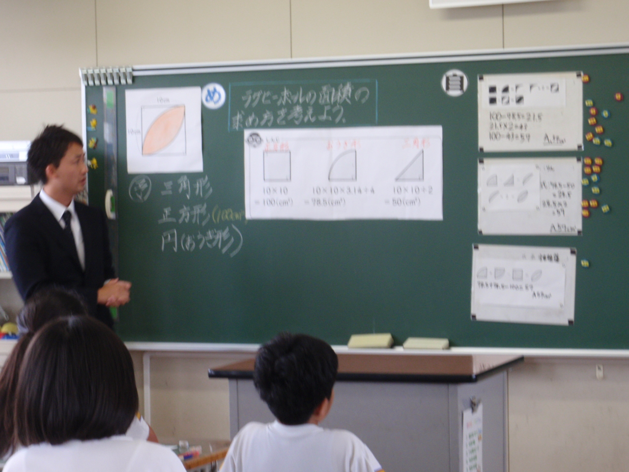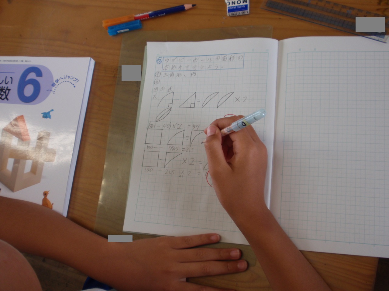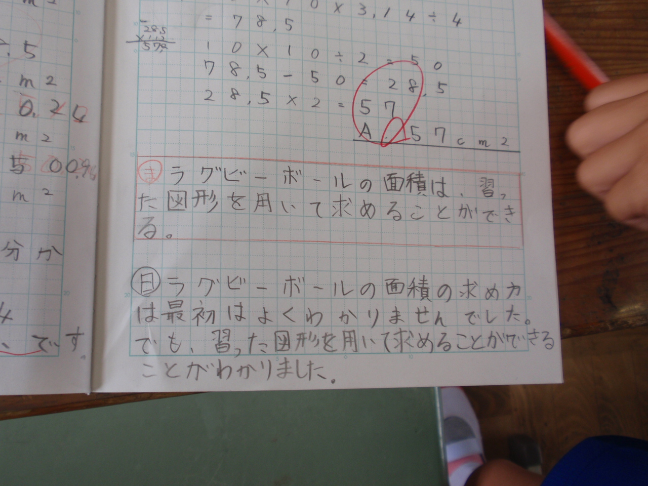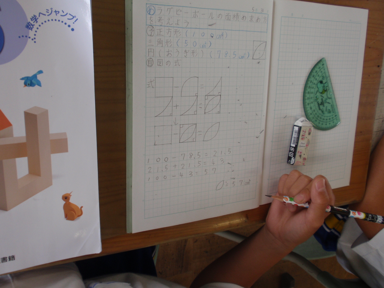 「6年:算数」~ラグビーボールの形の面積の求め方を考えました。