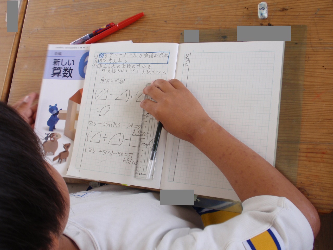 いろいろな方法が出され、それらを比較・検討する中で、複雑な図形の面積も「知っている図形の面積を組み合わせると求められる」ことに気がつきました。こうした学習は、多様な見方を育てるのに役立ちます。