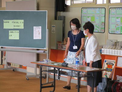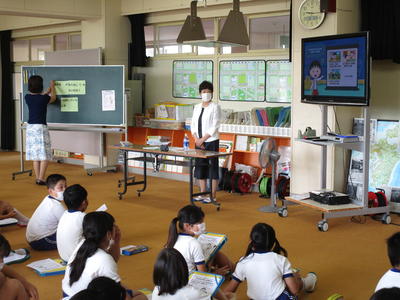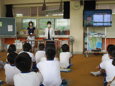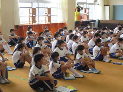 2020年9月3日 16時31分ここ数日風が心地よかったのですが、今日はまた蒸し暑い一日となりました。今日から虹色スマイルプロジェクトでは、4年生が考えた「幸」の文字のデザインをライトアップしています。また、5年生の家庭科の消費者教育として、消費生活センターの方においでいただき、買い物と消費者トラブルについて学習しました。