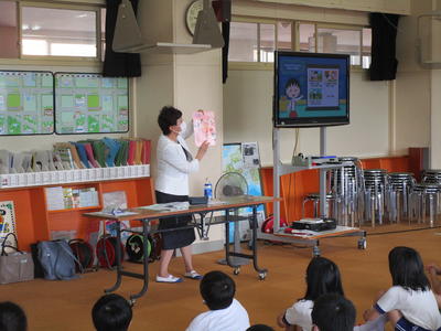 ここ数日風が心地よかったのですが、今日はまた蒸し暑い一日となりました。今日から虹色スマイルプロジェクトでは、4年生が考えた「幸」の文字のデザインをライトアップしています。また、5年生の家庭科の消費者教育として、消費生活センターの方においでいただき、買い物と消費者トラブルについて学習しました。