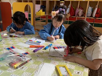 水がしみこみやすい紙に水性のペンで色を付けます。