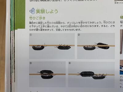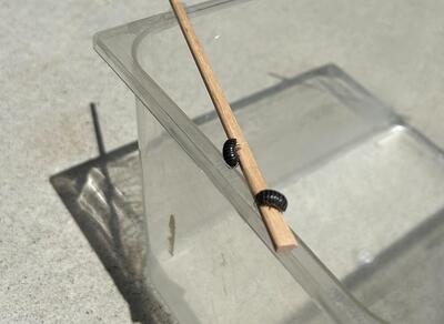 ダンゴムシが鉢合わせすると道を譲るか問題。本には「竹ひご」を歩かせると書いてあったのですが、竹ひごだとダンゴムシが落ちてしまいました。令和のダンゴムシは体力(筋力)が落ちているようです。