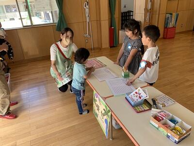 今日は「みゅう広場」。受付をすみれ組がやりました。