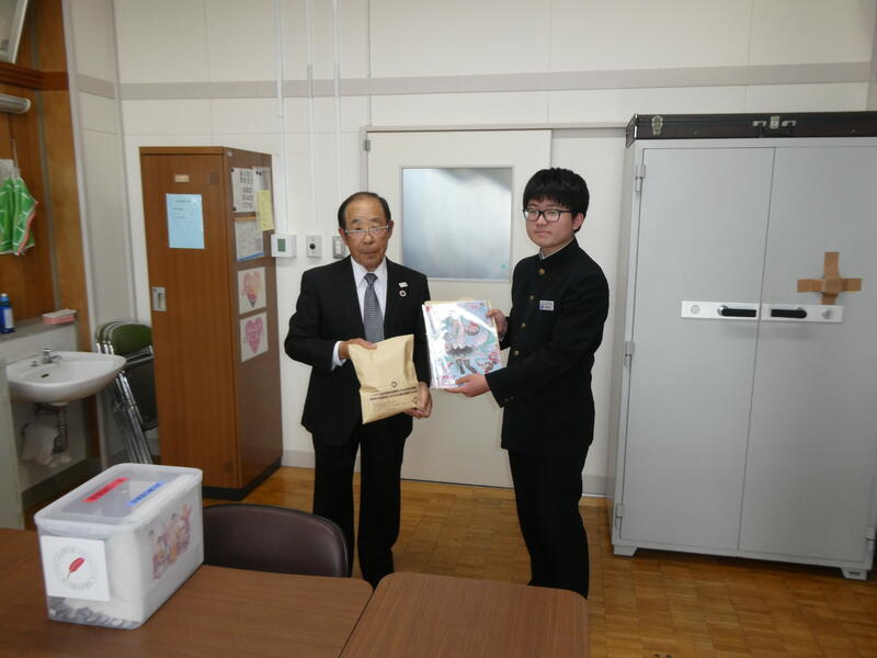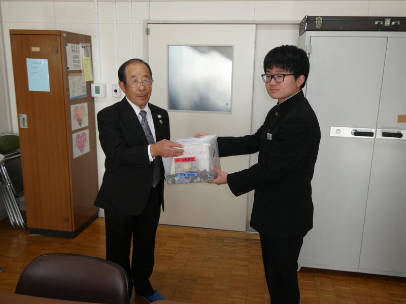 本校では,JRC奉仕委員会が中心になって「赤い羽根募金」を募りました。本日11月18日(月)にいわき市社会福祉協議会小名浜地区協議の会長様と担当の2名に来校していただき,代表生徒から手渡すことができました。