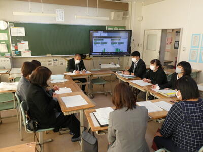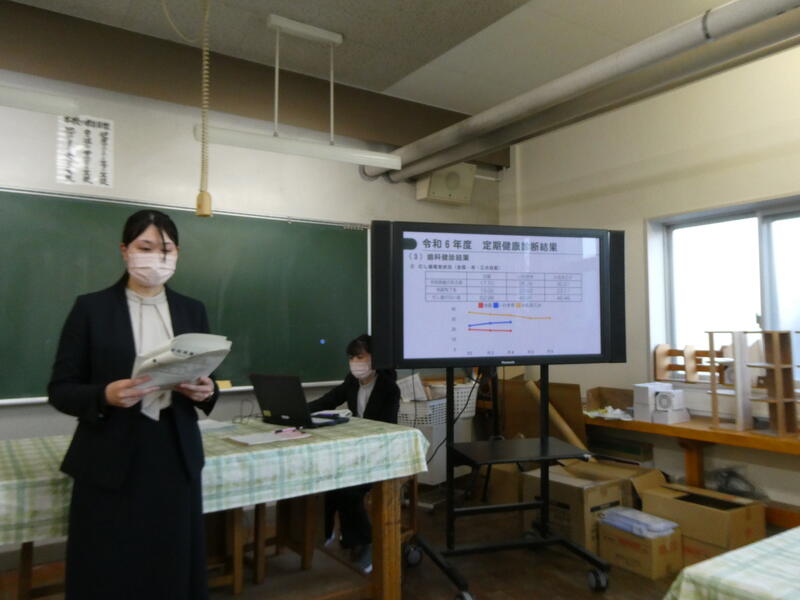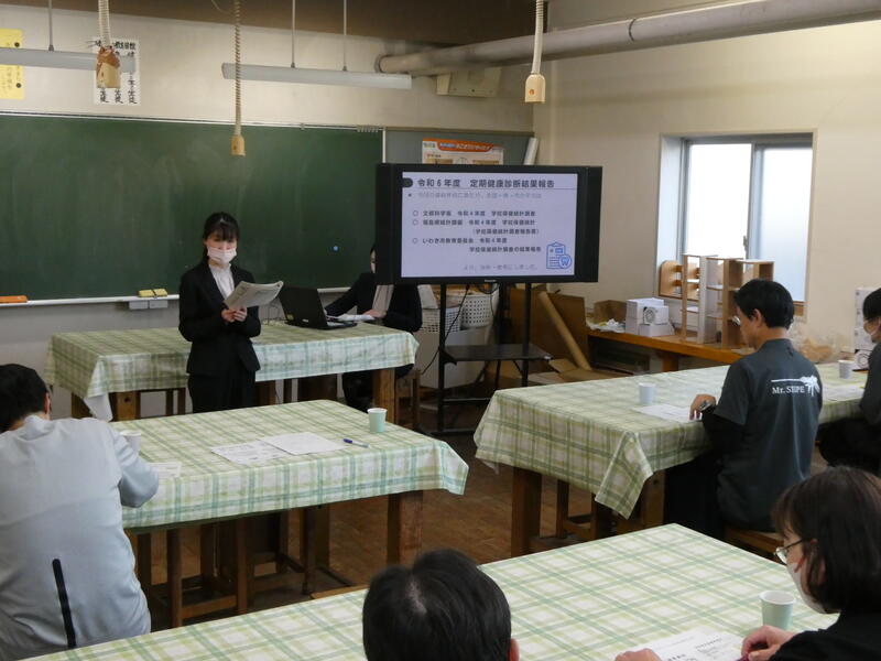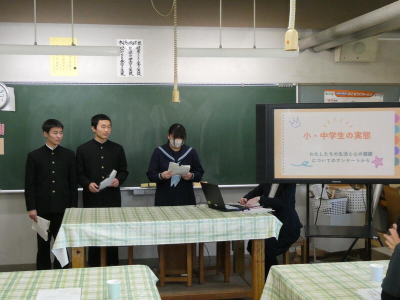 小・中学校それぞれの健康課題について全体で確認し,9年間を見通し発達段階に応じた健康教育について話し合いを行いました。また,保健奉仕委員の代表生徒が玉川中と小名浜三小の健康課題をもとに児童生徒全員にとったアンケート結果とその分析について発表してくれました。