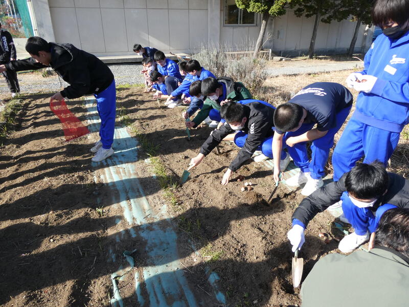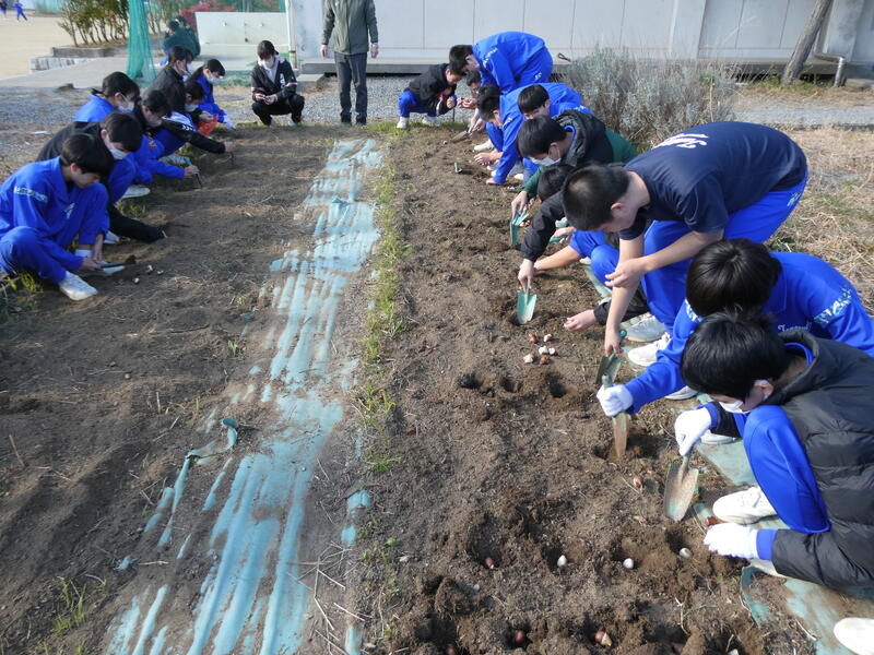本日12月10日(火)の昼休みに生徒有志がチューリップの球根の植え付けを行いました。