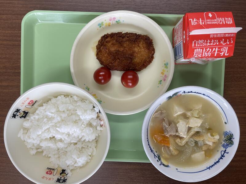 今日は、牛乳、ごはん、ももカツ、呉汁、ミニトマトが出ました。