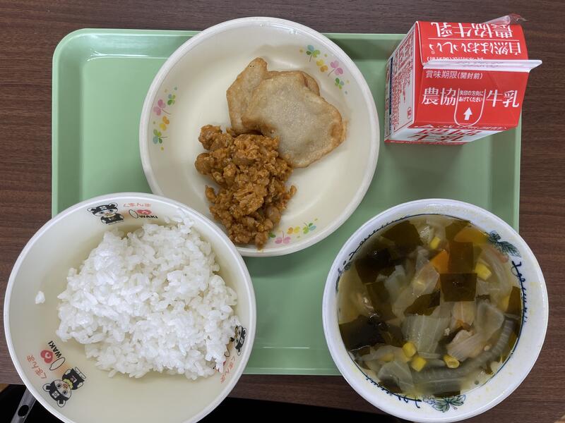 今日は、牛乳、タコライス、いかナゲット、野菜たっぷりわかめスープが出ました。