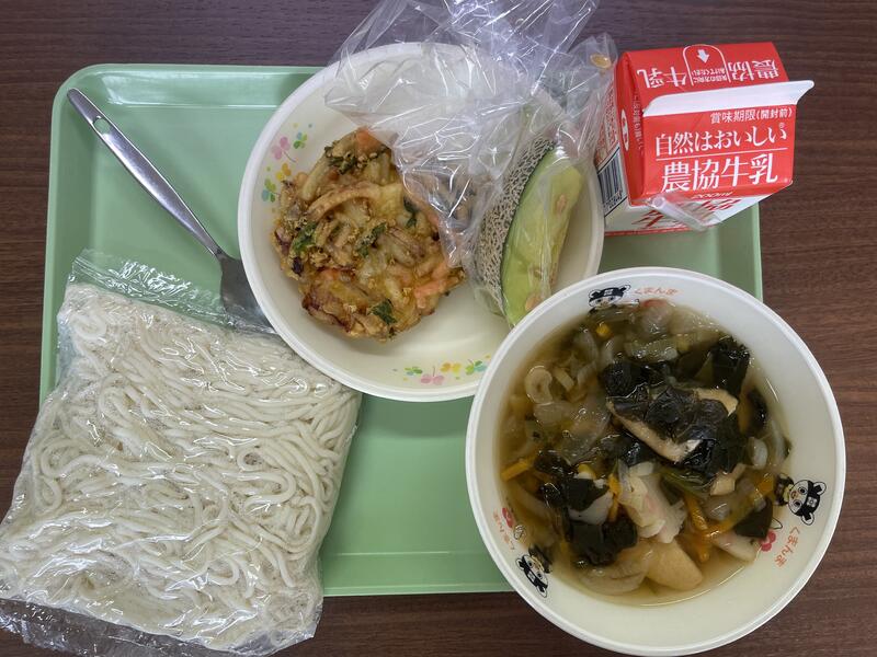今日は、牛乳、きつねうどん、小女子のかき揚げ、メロンが出ました。