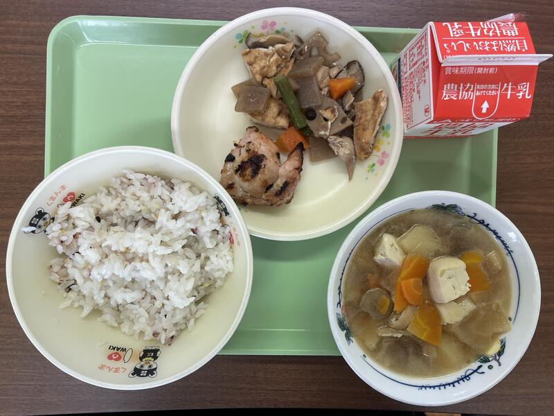 今日は、牛乳、雑穀ごはん、鶏肉のみそ麹焼き、お煮しめ、けんちん汁が出ました。