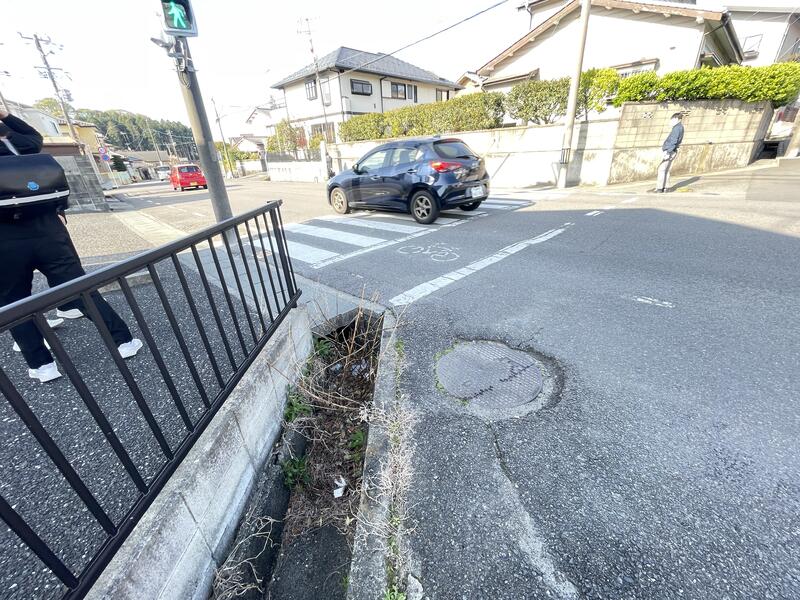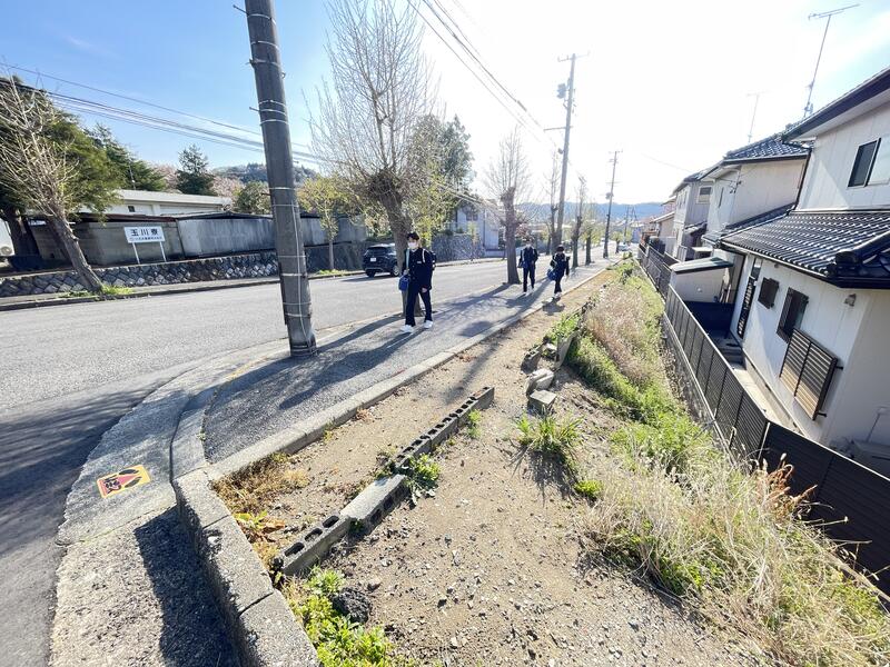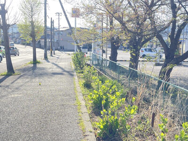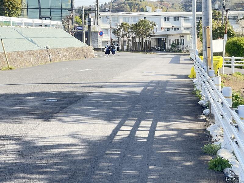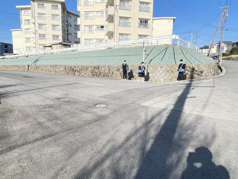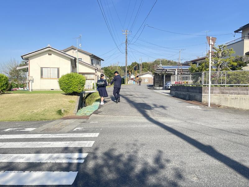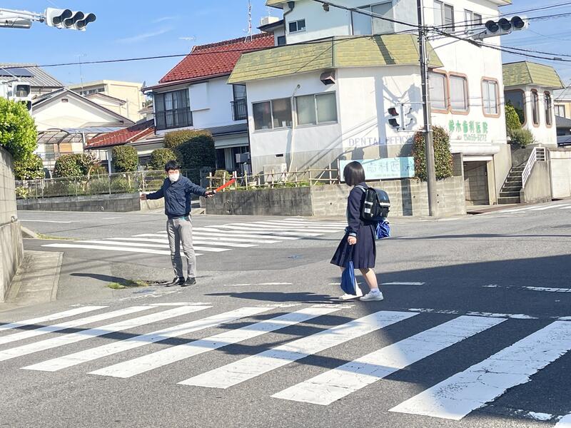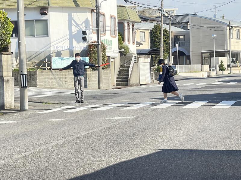 安全な登校に向けて、気をつけてほしい場所で立哨指導を行い注意喚起を行っています。