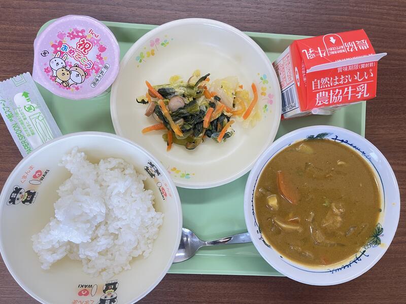 今日は、子どもたちが大好きなカレーライス、牛乳、ウインナーとキャベツのソテー、お祝いいちごゼリーが出ました。