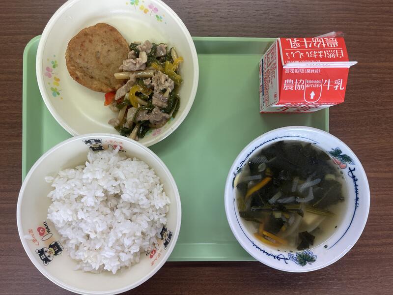 2023年7月7日 13時57分今日は、牛乳、麦ごはん、いわき揚げ、チンジャオロース、中華スープが出ました。