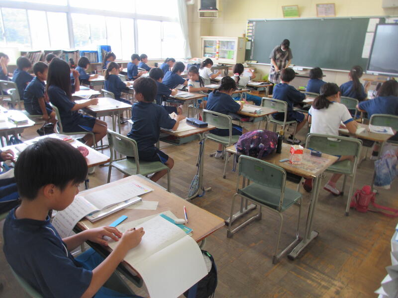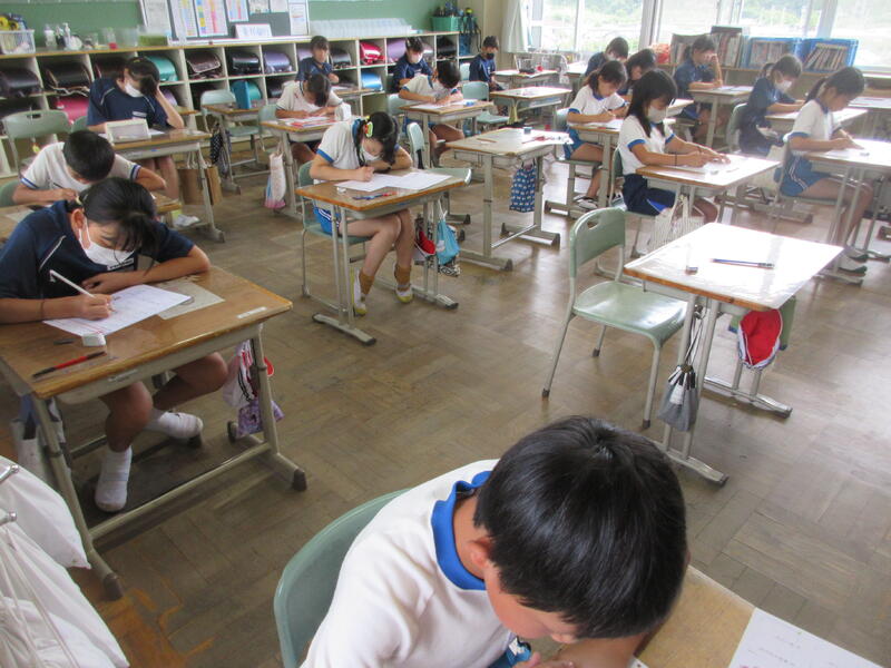 5年生は国語の授業。1学期に学習した漢字に挑戦です。しっかり覚えているかな?答え合わせをして、振り返ります。