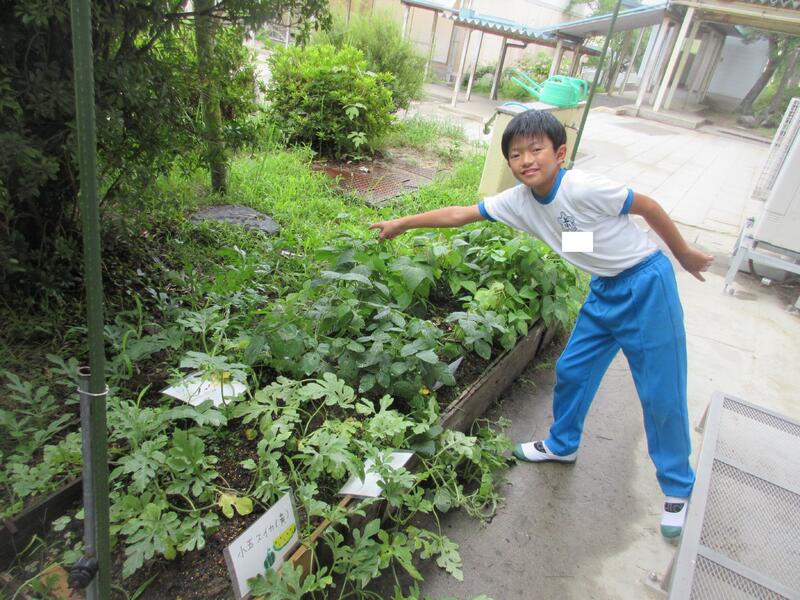 あすかい学級では、野菜を育てています。枝豆を収穫しました。これからは、少しずつ大きくなる小玉スイカが楽しみです。赤と黄色の2種類あります。