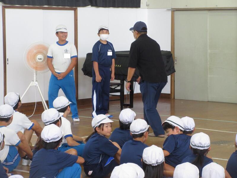 続いて、体育館で行った防犯教室では、いわ南警察署の警察官の方に、学校外で不審者に出会ったときの対応について、「①距離をとる。②声を出し逃げる。③すぐに大人に知らせる。」と説明していただきました。次に、不審者役の警察官の方が「どこの小学校?案内して。」や「お父さんが病気になった。」と声をかけるなど、具体的な場面を演技していただきました。子どもたちは、不審者から距離をとり、大声を出したり、ブザーを鳴らしたりするなどして逃げ、すぐ大人に知らせることができました。